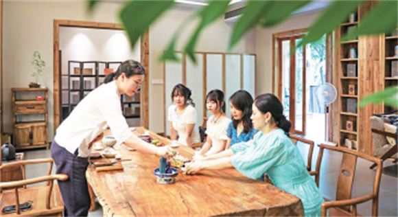 47148 次浏览 08-06楠乔里茶室。记者 胡瑾 摄在飞湖路,一片老旧开放式小区中,一间经过改造的三层茶室于日前亮相于人前。以木色为主的装饰清新爽利与周围的白灰色调形成鲜明反差,门楣上“楠乔里”读来文艺范十足,这家闹市中的茶室