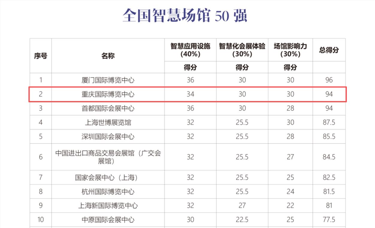 7770 次浏览 01-15重庆国博中心场馆智慧化水平再获行业肯定。近日,在最新发布的《中外会展品牌排行榜》中,重庆国博中心凭借其在数字化创新、智慧场馆建设等方面的突出表现,入选“全国智慧场馆50强”榜单前三强。 《中外会